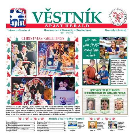 VĚSTNÍK, (USPS 658480) is published on the second and fourth Mondays of each month by SPJST, PO Box 100, Temple, TX 76503-0100. Subscription rates are $25 per year for non-members. Members’ fees are paid as part of the insurance fee collected by SPJST, 520 North Main, Temple, TX 76501. Second-class postage paid at Temple, TX and additional mailing offices. The exchange of opinions, ideas and information is a vital aspect of our fraternal Society and enables us to make more informed decisions. The views expressed by writers in the Věstník do not necessarily represent the views of the Editor or SPJST management. Please sign all correspondence intended for publication. POSTMASTER: Send address changes to VĚSTNÍK c/o Controller Roy Vajdak, P.O. Box 100, Temple, TX 76503-0100.
