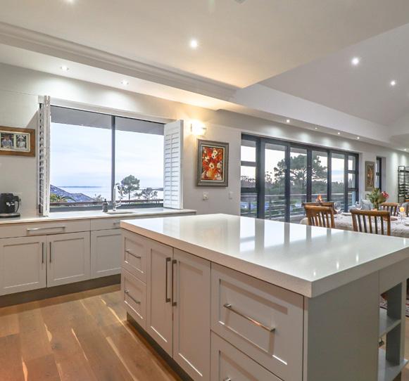 Contemporary, crisp and clean, the design allows for natural light to flood the interior living spaces ensuring a light and bright feeling throughout. Both upper and lower levels offer selfcontained living, each with dining area, built-in-BBQ and kitchen. Spacious with easy flow and neutral tones, the property is the perfect coastal home with breath-taking ocean views.