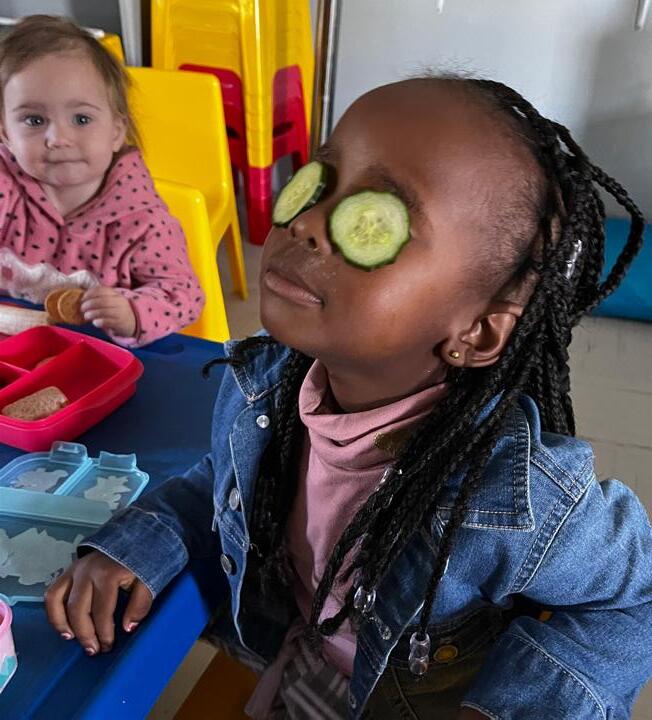 We have really gotten to know each other very well as we worked through the themes of the first term. We have learnt about our bodies, our senses, healthy habits and also spoke about our families and homes. In between, we have celebrated Valentine’s Day, had an exciting Athletics Day, an eventful Potjiekos Day and Fun Walk with all our new friends and families. One of the highlights for the term was learning about our senses. What a privilege it is to be able to experience our world through our senses! We learnt how different the world would be if we did not have eyes that can see, ears that can hear , a nose that can smell, a tongue to taste with and skin to feel with. During this theme, we smelt, tasted and guessed many different regular everyday smells and flavours. We learnt that great smells – like cocoa powder, cinnamon, and vanilla essence – don’t always have great tastes. With blind folds on we also got to taste and guess what flavour of popcorn we were eating (salty or sweet). We tried to feel and guess our shapes and use them to make a picture with blind folds on . We also learnt that we automatically put out our arms and hands when our eyes are covered. We also learnt that we don’t only have to feel with our hands. The skin on our arms, cheeks, feet and back can also be used to feel different temperatures and textures. Making and tasting a fruit salad was also a highlight for our healthy living theme.