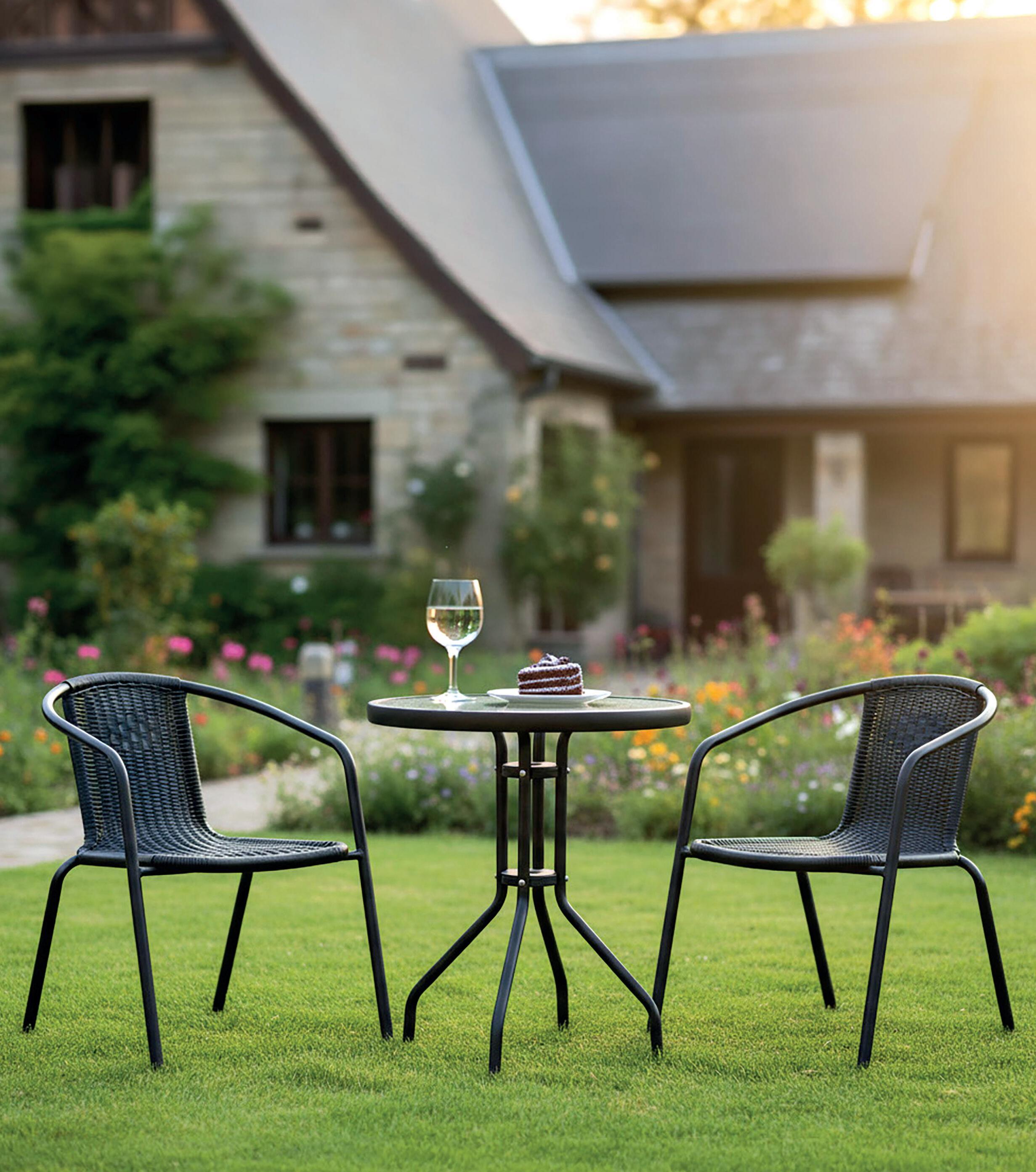 2 chaises 54 x 62 x 72 cm + 1 table Ø 60 x 72 cm, en acier, assise Wicker, plateau de table en verre trempé 5 mm, à monter soi-même. Éco-part incluse 1,06 e