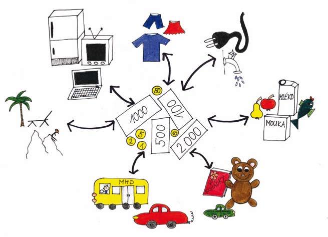 Minulý týden jsme paní učitelce platili za školní výlet. Stáli jsme ve frontě. Já jsem měl papírovou bankovku, kamarád Tomáš přede mnou platil bankovkou a mincemi (měl připravenou přesnou částku). Paní učitelka mi vrátila peníze, kterými platil Tomáš. Maminka mi vysvětlila, že to byl konkrétní důkaz toho, že peníze mezi lidmi neustále obíhají.