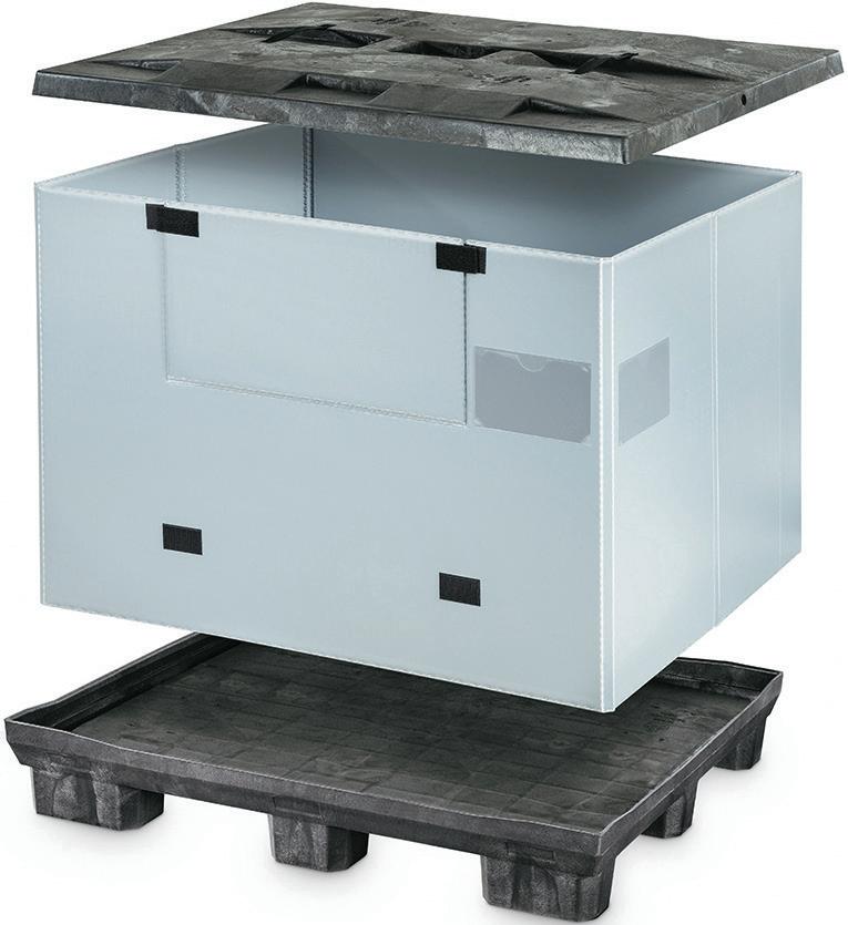 The internal capacity is 875 litres. Once collapsed, the height reduces by 75%, cutting return transport costs, emissions and warehouse space. A standard trailer can carry up to 384 collapsed units.