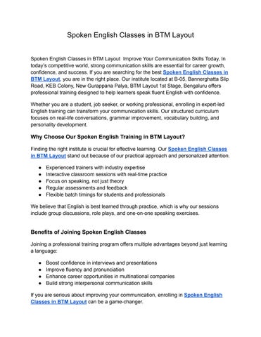Our center is strategically located in BTM Layout, making it easily accessible for students and working professionals. The classroom environment is friendly, interactive, and designed to encourage participation. If you are searching for trusted Spoken English Classes in BTM Layout, our institute provides the perfect blend of quality training and convenience. Contact Us: Spoken English BTM B-05, Bannerghatta Slip Road, KEB Colony, New Gurappana Palya, BTM Layout 1st Stage, BTM Layout, Bengaluru, Karnataka 560029 Phone : +91 63663 00811 Website : https://spokenenglishbtm.in/