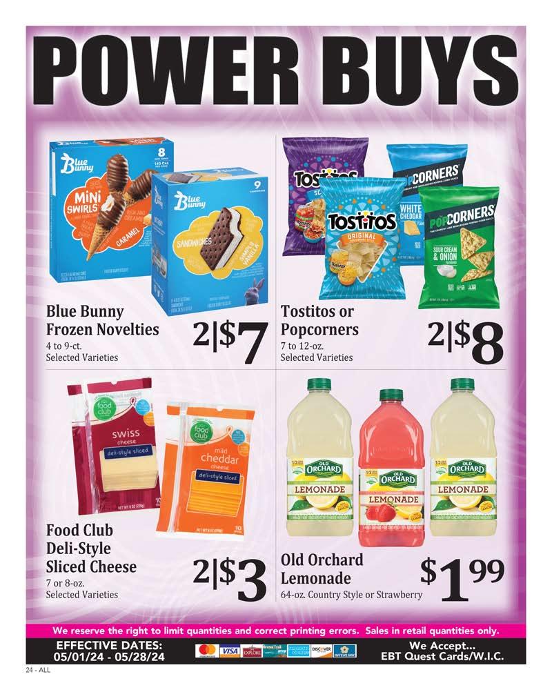 SWEET SOLUTIONS TO CELEBRATE Cinco de Mayo CRESTLINE AT GARLAND 9 a.m. - 8 p.m. DAILY, CLOSED SUNDAYS WE ACCEPT QUEST, DEBIT & CREDIT CARDS SALE DAYS MAY 1 THROUGH MAY 7, 2024 www.bargaingiantfoods.com 489-2148 2103 E. EMPIRE BARGAIN GIANT FOODS 899LB. MAUI FRYER BREASTS 5.99 LB. MAUI RIBS 8.99 LB. “ORIGINAL HAWAIIAN RECIPE” MARINATED SIRLOIN MAUI STEAKS™ JOHN MORRELL HOT DOGS FRESH SWEET CORN ON THE VINE TOMATOES 149LB. CALIFORNIA GREEN BEANS 69¢LB. CALIFORNIA GREEN CABBAGE WASHINGTON GROWN YELLOW ONIONS 49¢LB. CALIFORNIA BRUSSELS SPROUTS USDA CHOICE BEEF BLADE CHUCK STEAK USDA CHOICE BEEF T-BONE STEAK USDA CHOICE BEEF CROSS RIB ROAST 399LB. CRAVEN POTATO CHIPS 199EA. 8 OZ. BAG SEEDLESS WATERMELON 59¢LB. SCOTT PAPER TOWELS 6 ROLL PACK MT. OLIVE KOSHER DILLS WHITE MUSHROOMS RED & GREEN LEAF LETTUCE USDA CHOICE BEEF CROSS RIB STEAK 499LB. MAUI MARINATED PORK CUTLETS FOOD CLUB 100% BEEF PATTIES 999EA. 24 OZ. BAG 10 LB. BAG 12 OZ. PKG. 3 LB. BAG. 12 COUNT 80 OZ. JAR JUANITAS TORTILLA CHIPS CHARCOAL BRIQUETTES DOZEN CHERRY LANE JUMBO EGGS MAUI MARINATED PORK RIBLETS 299LB. USDA CHOICE BEEF RUMP ROAST 3 99 LB. 899LB. 299LB. 399LB. 299EA. 10/500 149LB. 99¢EA. 299EA. 599 599EA. 149LB. 199LB. 3 99 EA. 2/300 POWER BUYS