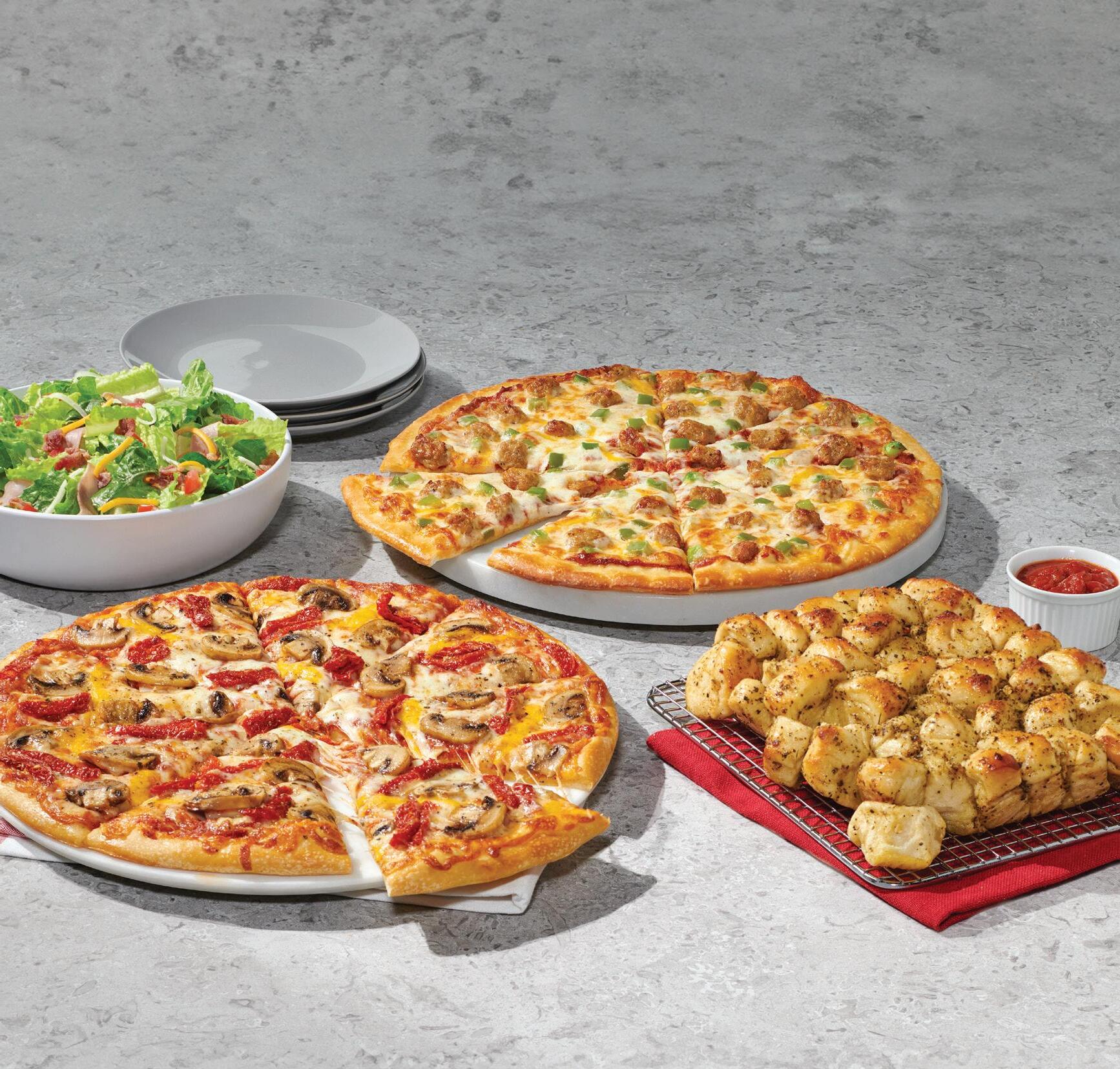 Recipe or up to 5 toppings on Thin or Original crust and choose from Cheesy Bread, Garlic Monkey Bread, Cinnamon Monkey Bread or Salads