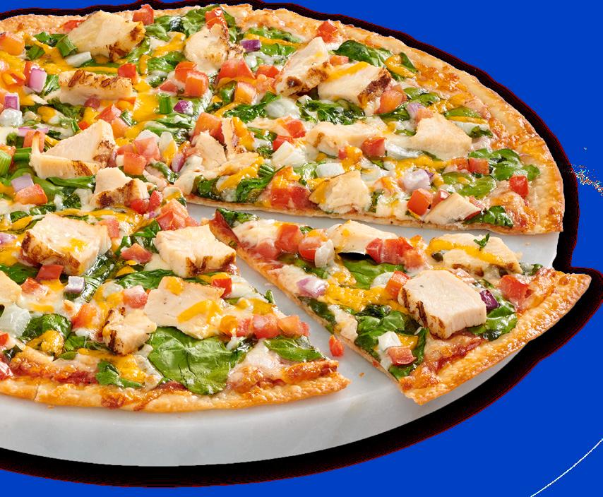 Chicken, Bacon, Artichoke Hearts, Spinach, Parmesan, Zesty Herbs, Mozzarella, Creamy Garlic Sauce on Thin Crust