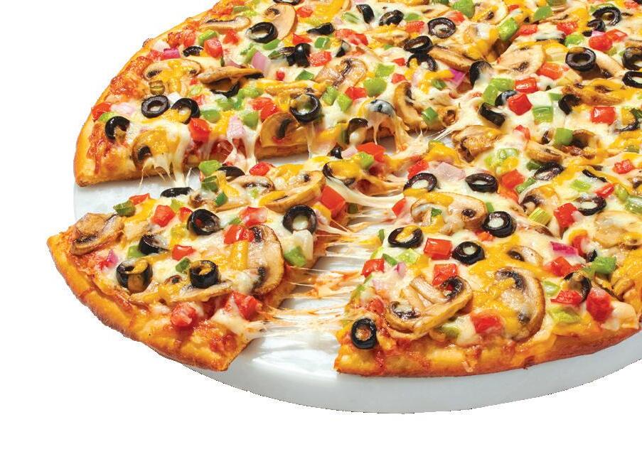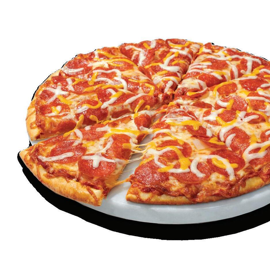 Pepperoni, Sausage, Mushrooms, Black Olives, Herb & Cheese Blend, Mozzarella, Red Sauce in Large or Family Size