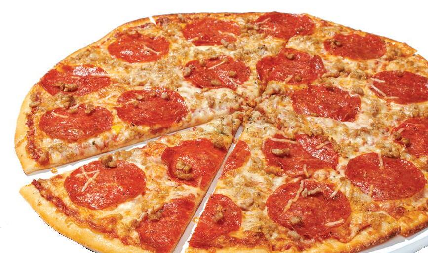 Giant Pep peroni, Ground Sausage, Mozzarella, Parmesan, Herb & Cheese Blend, Zesty Herbs, Garlic, Red Sauce, on extra large, foldable New York Style Crust