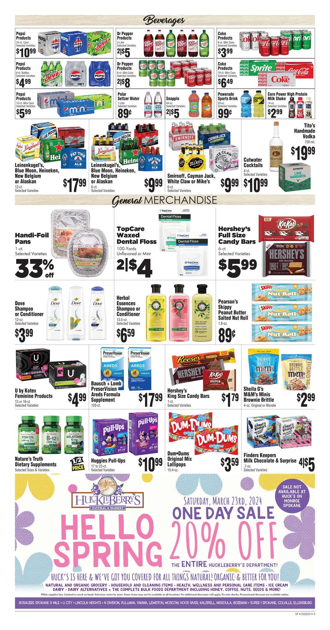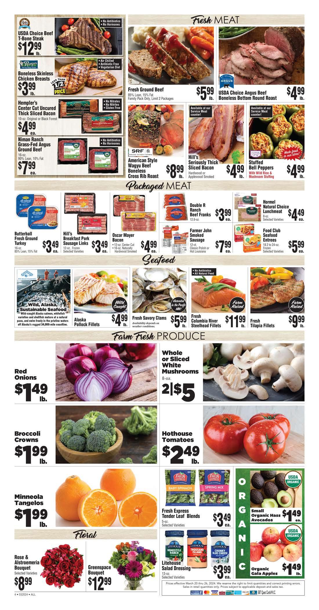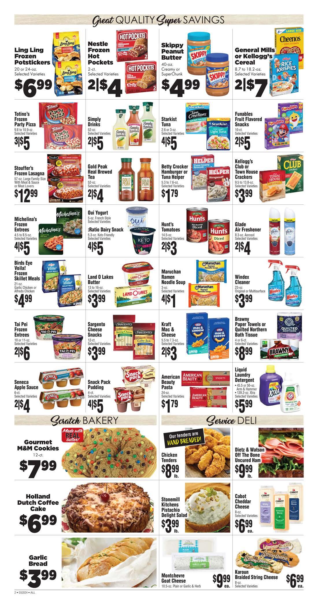 bread will be gummy. Form a round flat shape and cut a cross in the top of the dough to bake more evenly (and let the fairies out). You have choices for how to bake this: You can bake it in an oiled but not preheated cast iron skillet, in a greased and floured round cake pan or on a greased baking sheet. They all work. Bake for 40 to 50 minutes. When done, the bottom of the bread will sound hollow when tapped. I like to brush the crust with melted butter. Serve warm, slathered with more butter. Irish soda bread is not only a tasty and versatile treat, but it also carries with it a rich history and cultural significance. Plus, it’s a cinch to make! Why not give it a try in your own kitchen? *** Lifestyle expert Patti Diamond is the penny-pinching, party-planning, recipe developer and content creator of the website Divas On A Dime -- Where Frugal, Meets Fabulous! Visit Patti at www.divasonadime.com and join the conversation on Facebook at DivasOnADimeDotCom. Email Patti at divapatti@divasonadime.com (c) 2024 King Features Synd., Inc. IRISH SODA BREAD PAIRS WELL WITH BUTTER AND JAM, USE IT FOR SANDWICHES, OR ALONGSIDE A HEARTY STEW. Discover the Magic of Irish Soda Bread: A Taste of Ireland’s Culinary Tradition “OLDEST MEAT MARKET IN TOWN” CORNER OF SPRAGUE & HELENA 535-4932 WE ACCEPT EBT CARDS MON. - SAT. 7AM - 7PM SUNDAY 9AM - 6PM SONNENBERG’S MARKET & DELI 3-20-2024 THRU 3-26-2024 Check out our website: www.sonnenbergsmarket.com SONNENBERG’S MARKET & DELI WE’VELOTTOGOT $399 $499 NOW AVAILABLE ON LINE SHOPPING BEEF RIBEYE STEAKS IN THE BAG CUT-N-WRAP FREE $799 LB. LB. LB. WHOLE FRYER 3 TO 5# AVG SMOKED KEILBASA $149 LB. MINI CARROTS FUJI APPLES LB. 1# PACKAGE LARGE NW GROWN WASH EXTRA FANCY SWEET RED 89¢ GREEN BELL PEPPERS EA. $199 LB. $799 $199 $199 LB. LB. LB. NEW YORK STEAKS THICK CUT PORK STEAK OR ROAST BONE IN HAMS PRIME RIB ROAST 89¢ DELI HAM OR TURKEY BUY ONE GET ONE FREE $199 LB. LB. LB. $299 $799 GRAPEFRUIT ROMAINE LETTUCE $129 4/$500 2/$400 VINE CLUSTER TOMATOES CHICKEN BREAST OR THIGHS BONELESS SKINLESS BONELESS PORK CHOPS IN THE BAG CUT-N-WRAP FREE $499 LB. SLICED BACON THICK CUT HICKORY OR PEPPERED