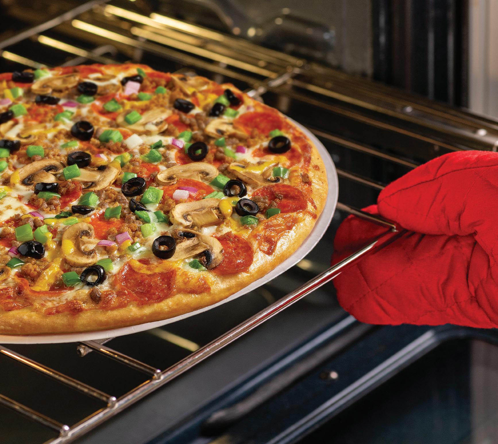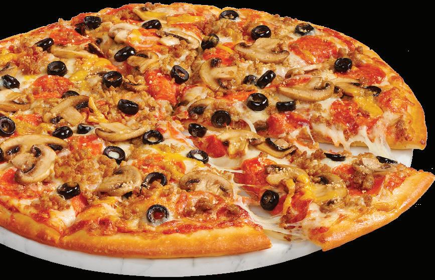 Pepperoni, Sausage, Mushrooms, Black Olives, Herb & Cheese Blend, Mozzarella, Red Sauce in Large or Family Size