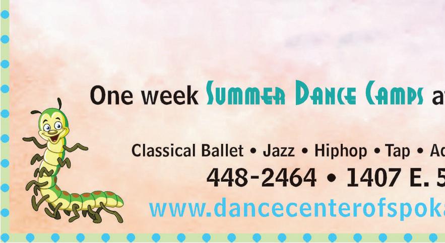 Gonzaga Summer Dance Intensive, Senior session (Ages 13-20) July 2226, Junior Session (Ages 9-13) July 29-Aug. 2. Programs focus on ballet and contemporary technique with supplemental classes in jazz, hip-hop, modern, dance composition, pilates, and musical theatre. Classes taught by Gonzaga University Faculty and guest artists in the Gonzaga Dance Studios and the Myrtle Woldson Performing Arts Center. Registration includes an SDI t-shirt and lunch on final day. Auditions are not required as a placement class will be held on the first day. Intermediate/advanced $350, increases to $400 after July 7. Beginner/Intermediate $200, increases to $250 after July 7. erickson@gonzaga.edu, www.gonzaga.edu/ college-of-arts-sciences/departments/theatre-dance/dance/prospective-studentprograms/summer-dance-intensive, (509) 313-4417