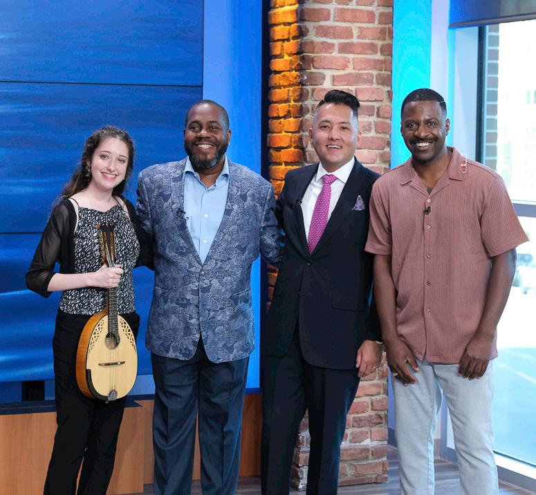 From left: Carrera with Kenneth Overton, John Concklin, and Jamarcus Gaston on WSPA's Your Carolina; Carrera performing her concerto with the Youth Orchestra (2023); Carrera jamming with the Kruger Brothers before the performance; Carrera with Kenneth during the Sept. 2025 concert; Kenneth and Carrera preparing to go on Your Carolina.