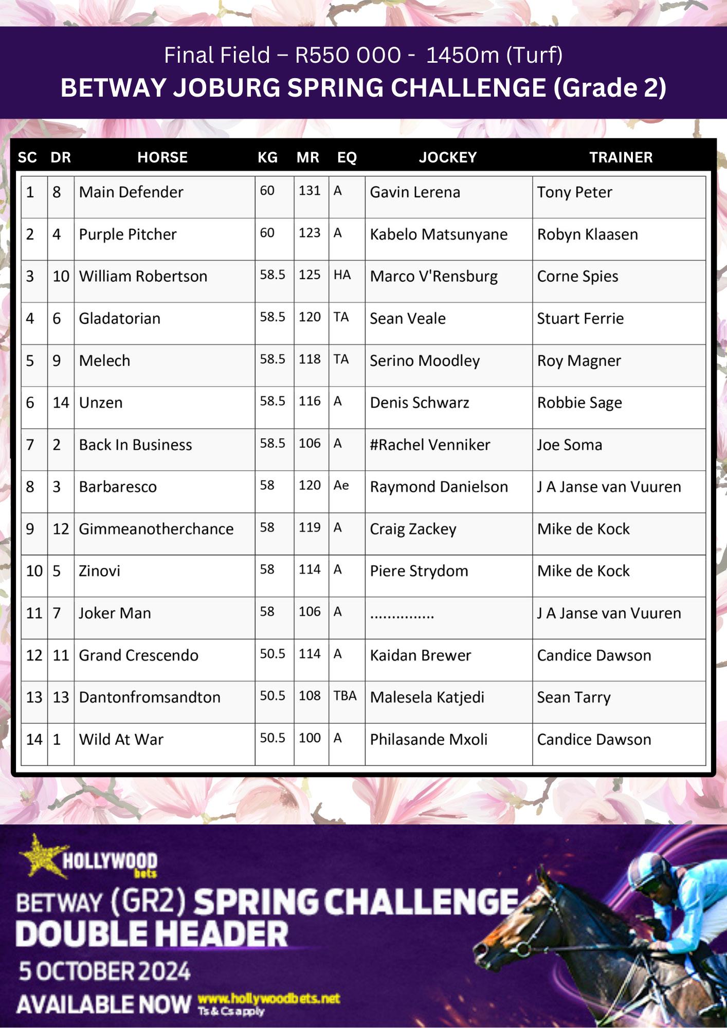The Tony Peter-trained Main Defender beat the subsequent Equus Champion Sprinter Thunderstruck by over 6 lengths in a dazzling victory last year and bang in-form Highveld rider Gavin Lerena takes the reins for the first time in the fourteen horse line-up.
