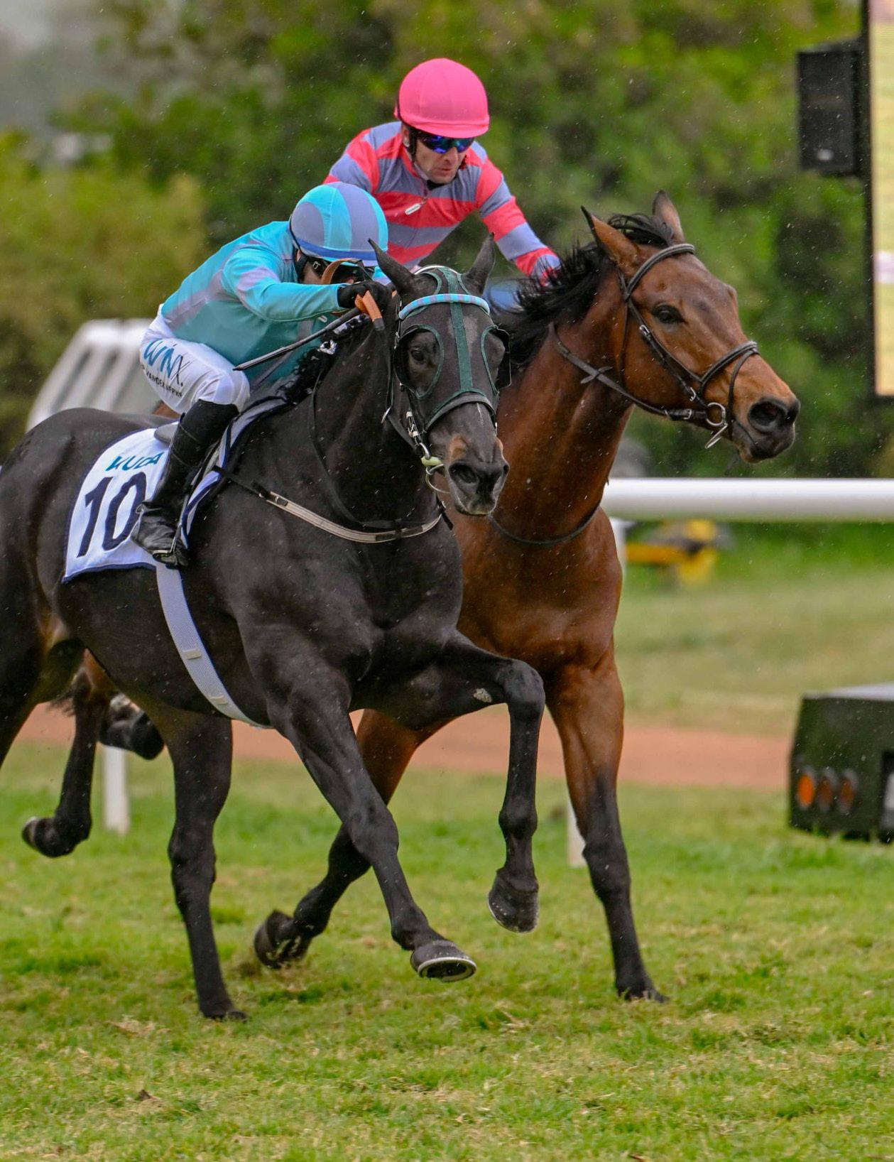 Questioning (JP van der Merwe) beats the gutsy Montien under Anthony Andrews. Corne Orffer on Outlaw King can be seen further back | Credit: Chase Liebenberg