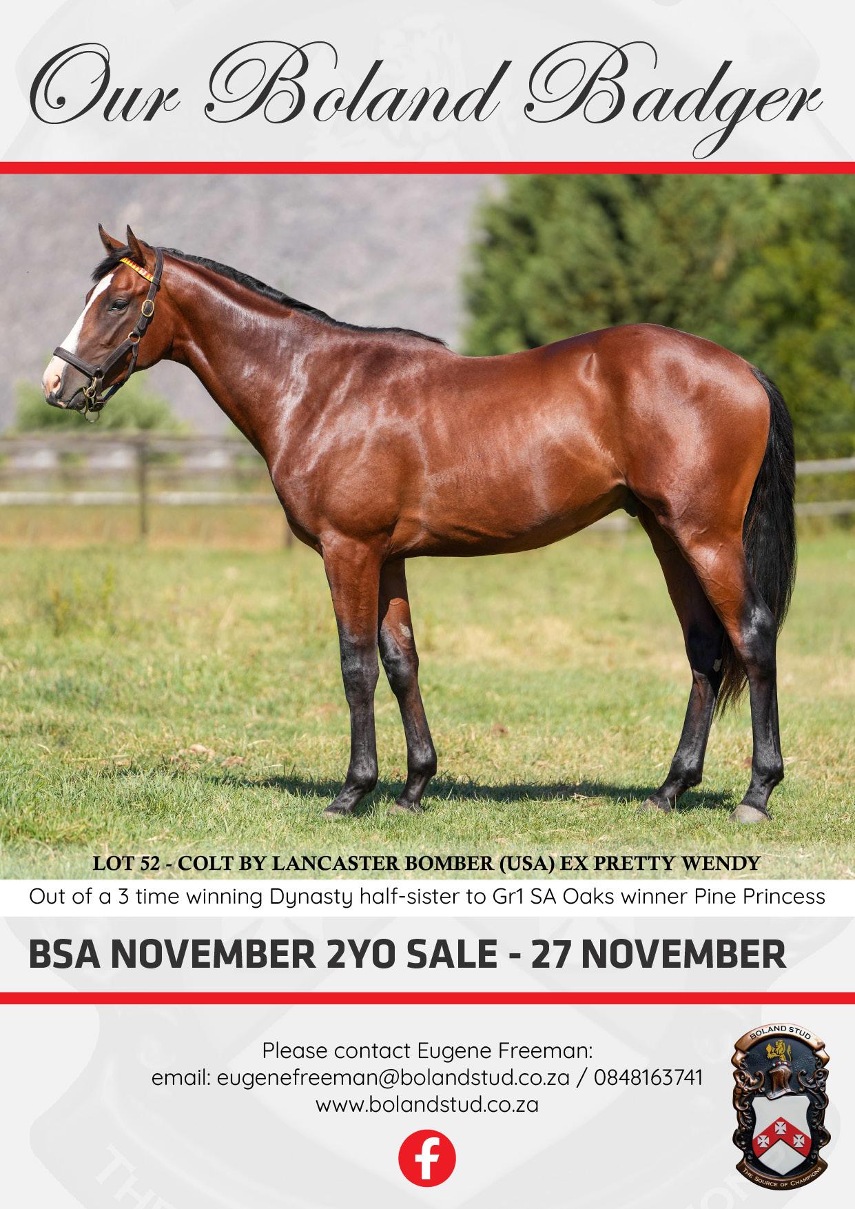 South Africa’s Horse Of The Year in 2014-2015, Futura has five lots catalogued for the November Two Year Old Sale on Sunday, including a half-sister (Lot 87) to Gr2 WSB Guineas runner up Supreme Warrior, and a colt (Lot 180) bred on similar lines to the Dynasty