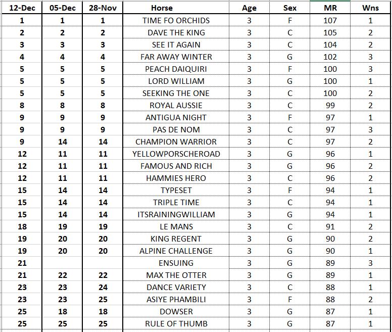 Karel Miedema’s Raceform takes a more conservative view on the ratings, using a slightly different scale, but effectively also rank Charles Dickens on top of the current classic generation with a RFR of 110 vs 107 for Cousin Casey, and ahead of the visiting brigade, including Anfields Rocket (RFR 103, draw 13/15).