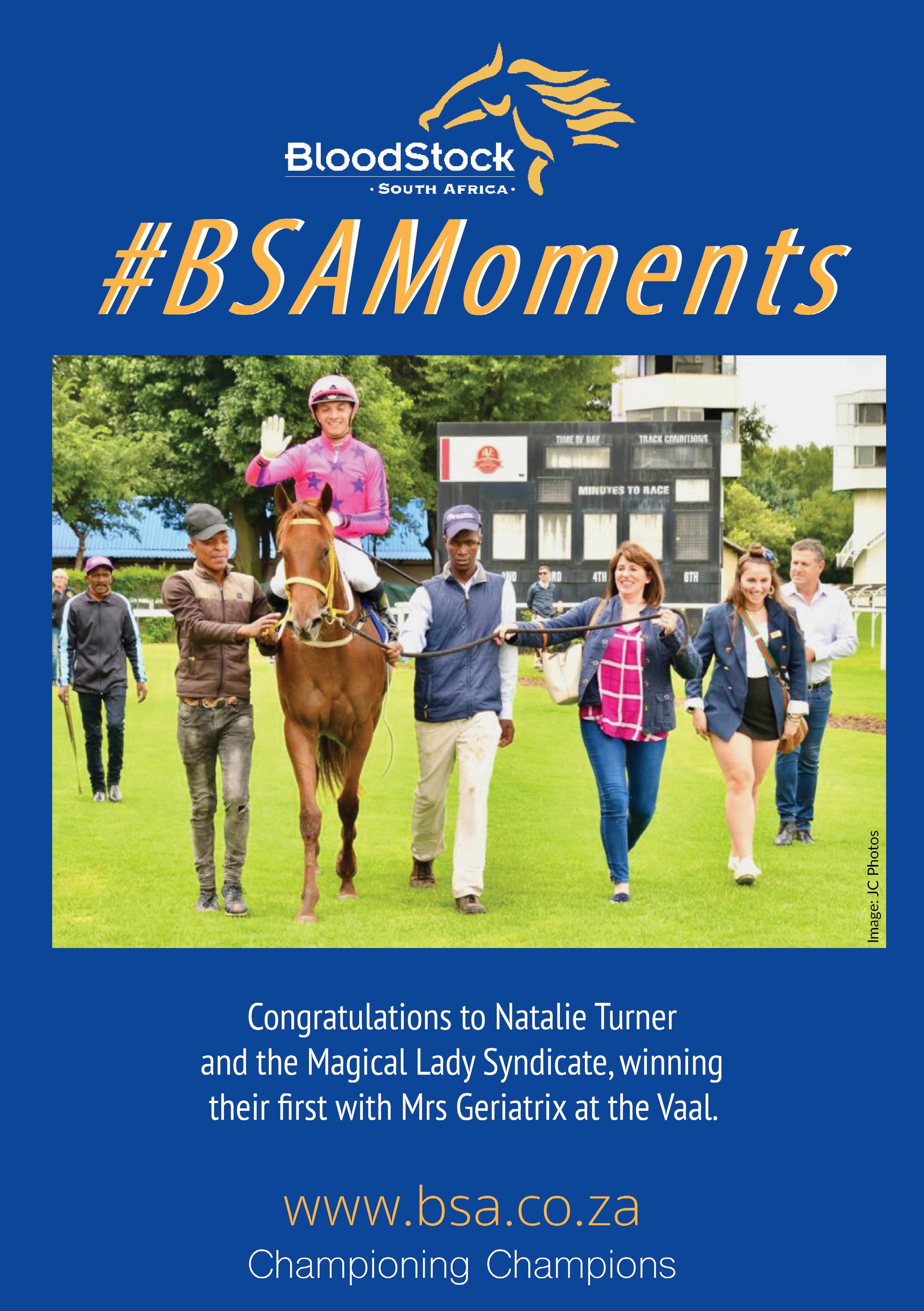 A passionate and wellinvested owner, race sponsor and a benefactor of the sport via the Star Grooms initiative, Lady Laidlaw has enjoyed her racing in South Africa since 2008 when purchasing the subsequent dual Guineas winner and sire, Noordhoek Flyer.