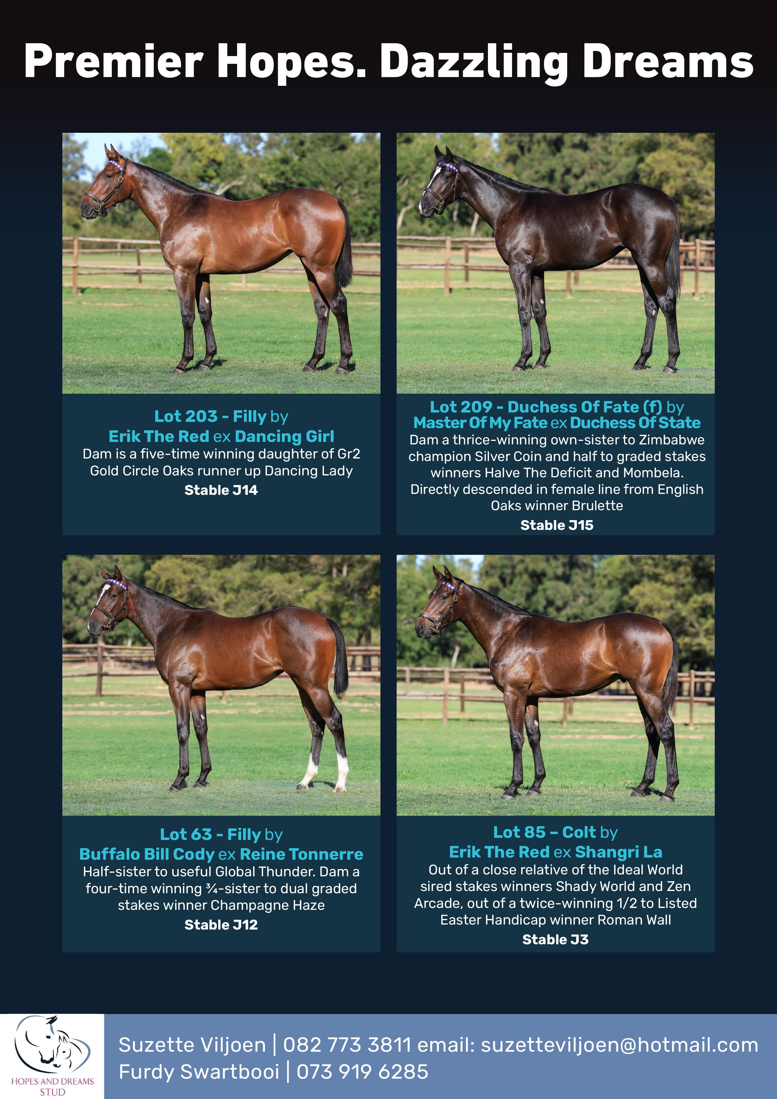 Quality is the name of the game in Narrow Creek Stud’s Premier Yearling Sale draft. From siblings to current exciting prospects, offspring of top-class racemares, and relatives of the likes of Isivunguvungu and Buffalo Storm Cody, Narrow Creek will be offering something to suit every buyer. John Everett will also be offering yearlings by some of South Africa’s most sought after stallions, namely Buffalo Bill Cody, Hawwaam, Jet Dark, Malmoos, Rafeef and What A Winter.