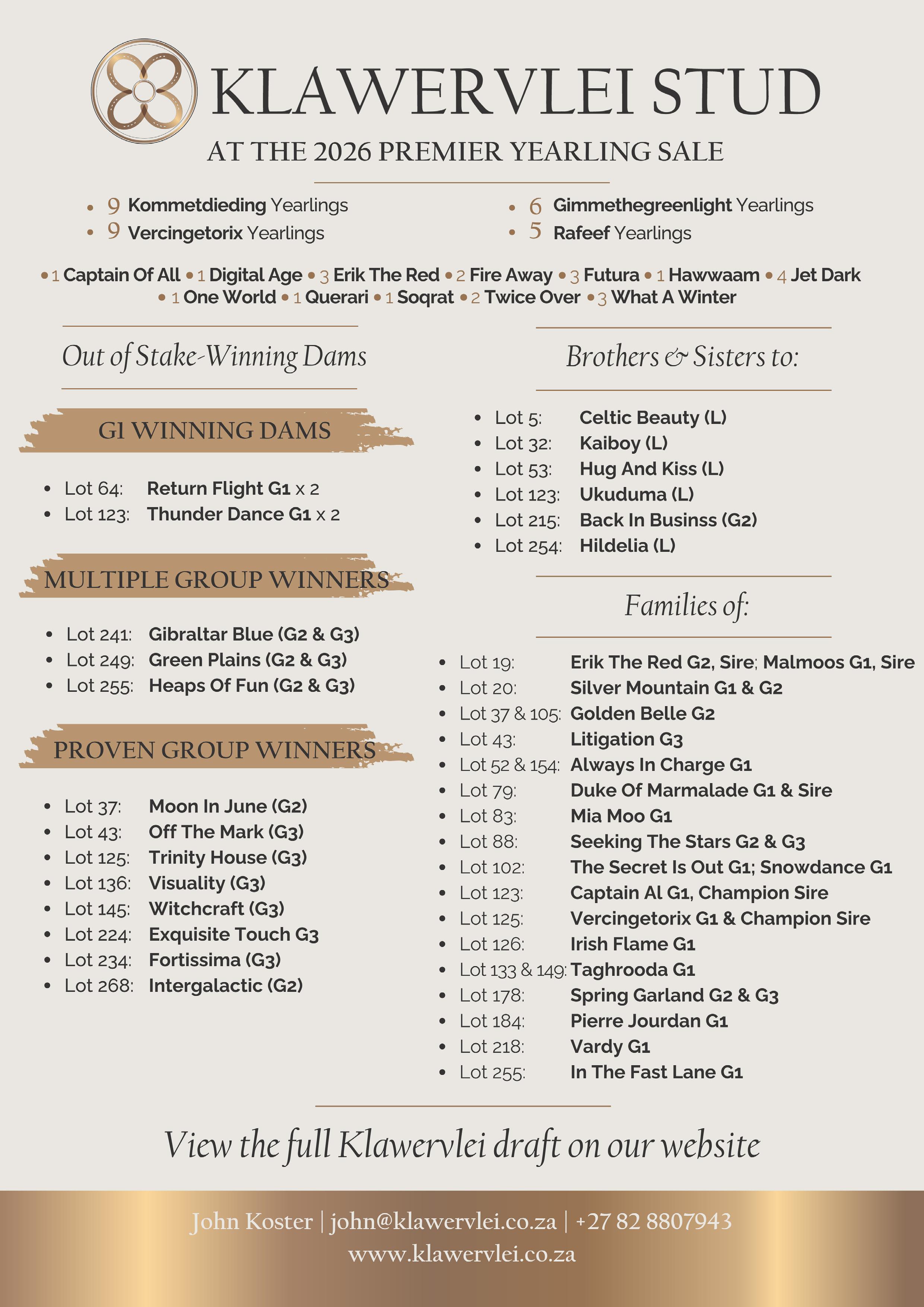 Quality is the name of the game in Klawervlei Stud’s draft for the 2026 Premier Yearling Sale. Not only is the champion nursery offering, yearlings sired by such top-class stallions as Vercingetorix, Gimmethegreenlight, Rafeef, and One World, the farm will also be offering yearlings from some of the best families in the stud book.
