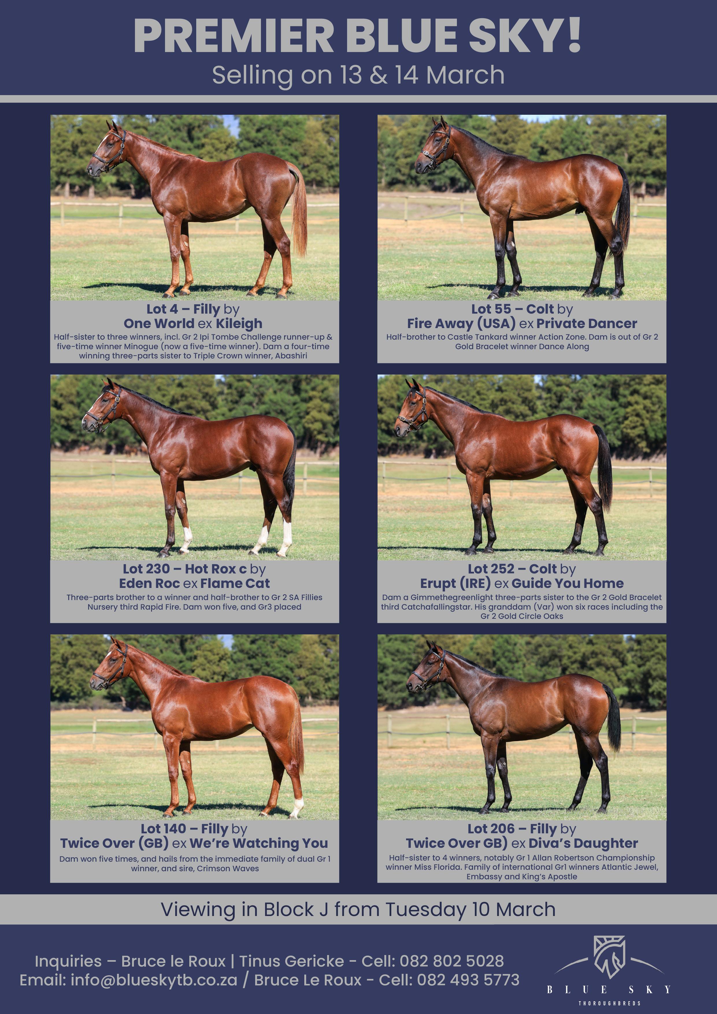 For more information on Blue Sky Thoroughbreds’ Premier Sale draft, please contact Bruce Le Roux or Tinus Gericke on info@blueskytb.co.za.
