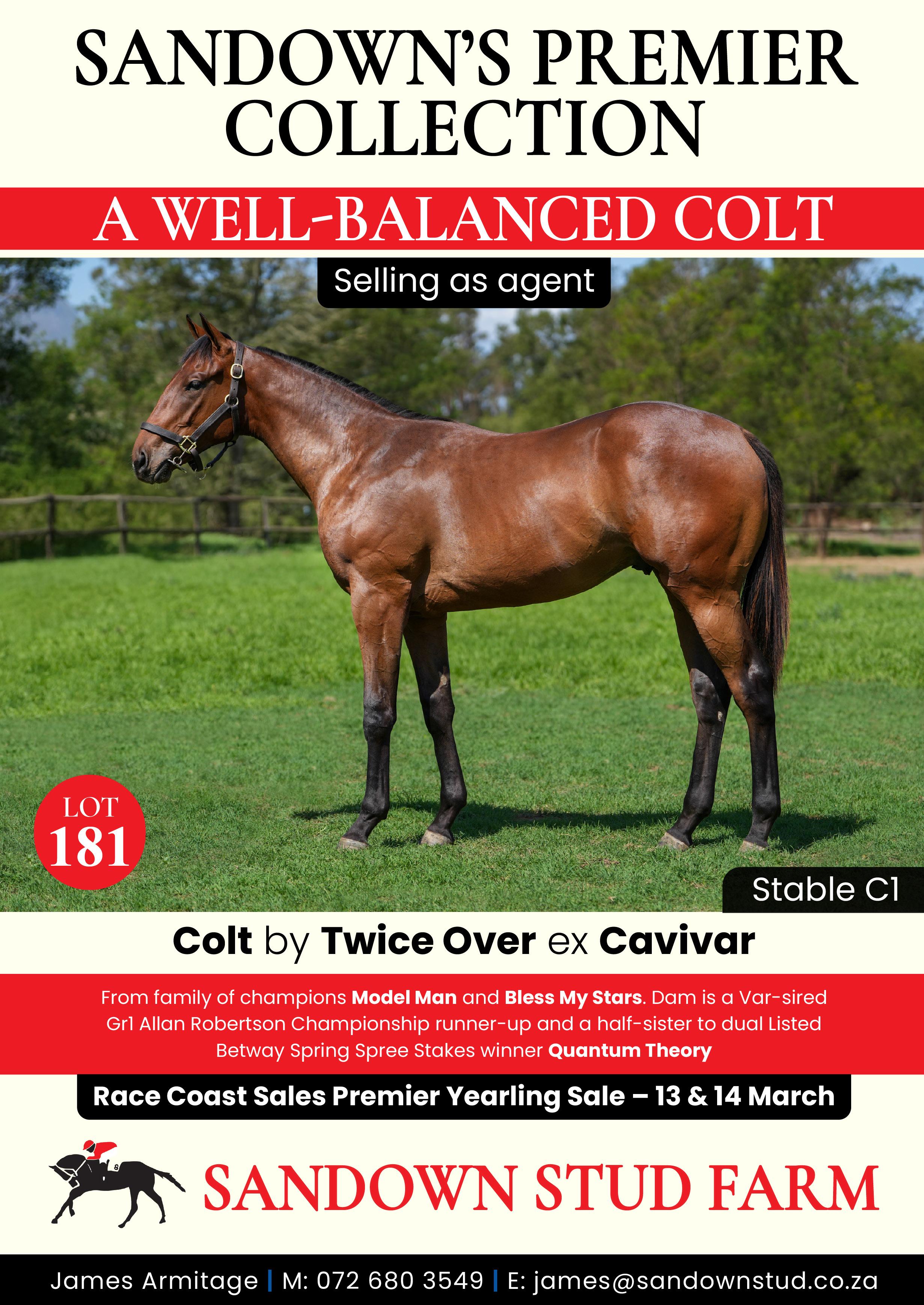 By Captain Al’s Triple Crown winning son, this colt is out of a four-time winning full-sister to Gr3 Cape Racing Victress Stakes runner up Heart Stwings. Imposing, solid colt. His 2yo half sister, Platinum Shay, ran a promising 3rd on debut at the Vaal.