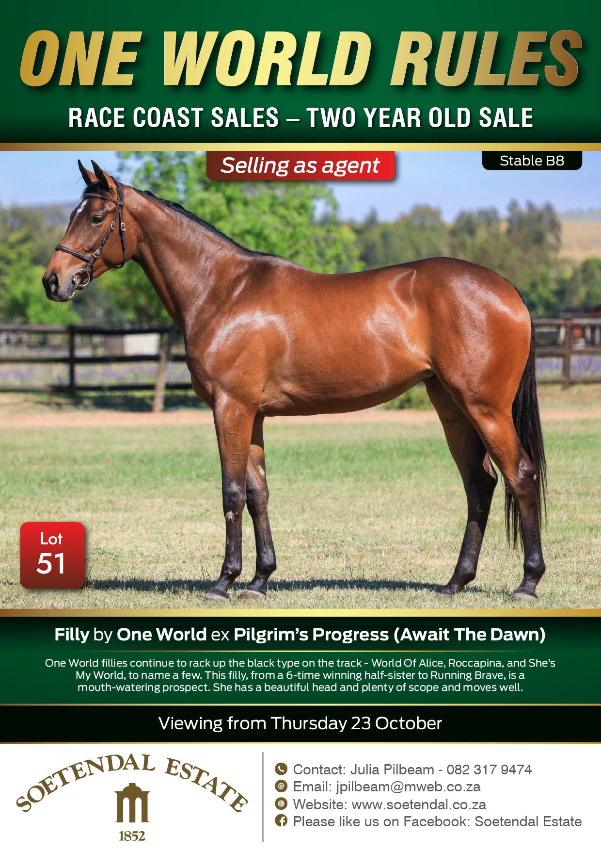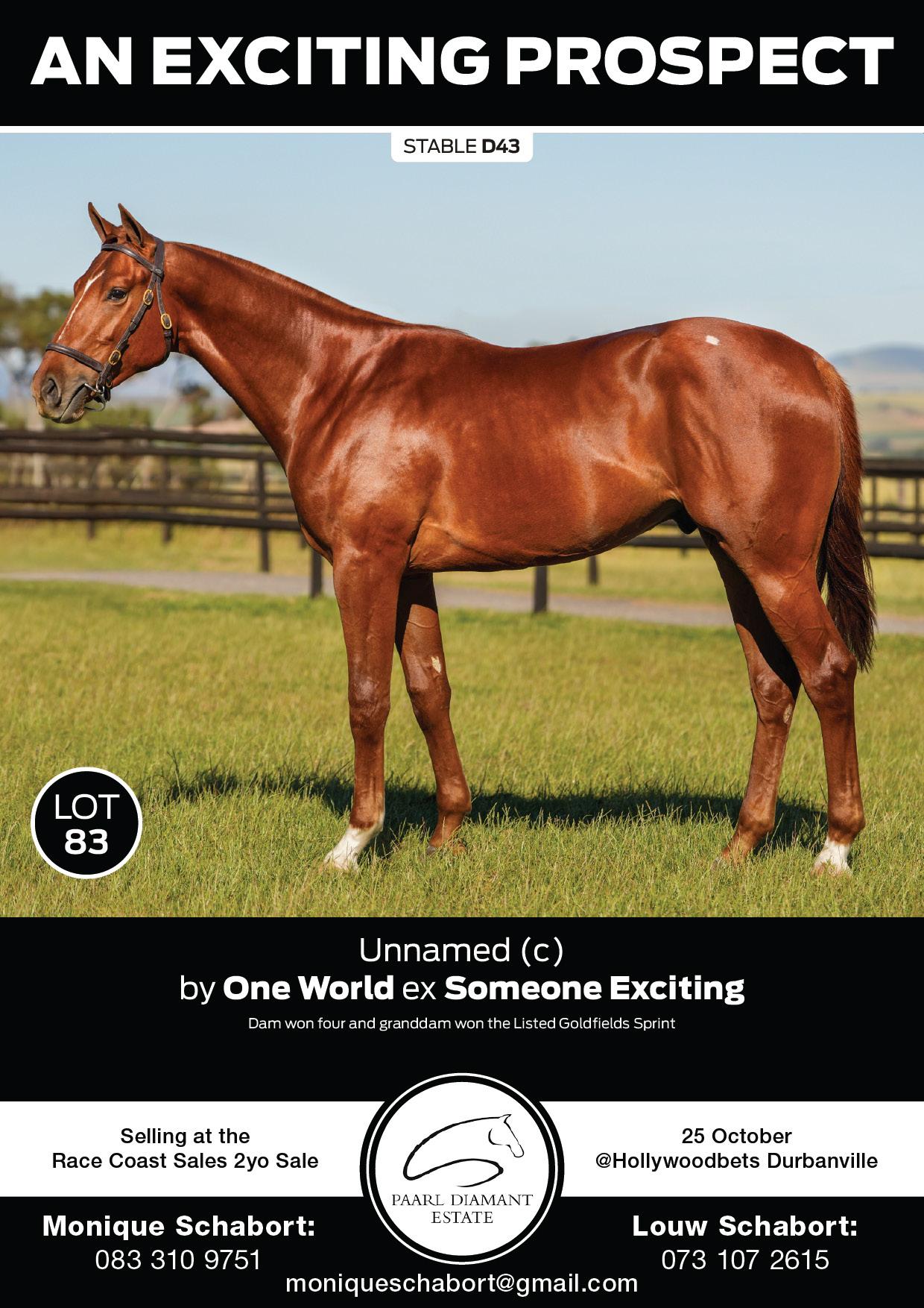 By one of South Africa’s most promising stallions, out of a four-time winning daughter of Goldfields Sprint Listed winner Lady Perez. He is an athletic son of One World that shows a good turn of foot. This scopey colt has a good rein and shows great action.