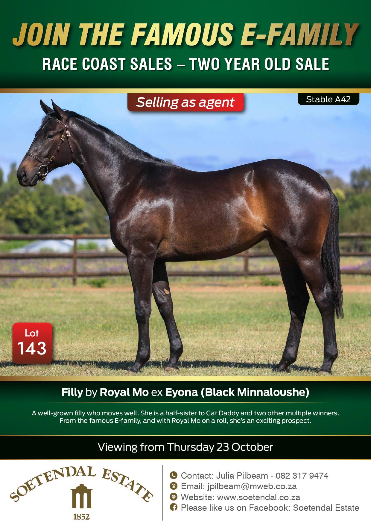 Paarl Diamant’s Monique Schabort will be bringing a very smart draft to this year’s Two-Year-Old Sale, with this consignment including two-year-olds sired by the likes of Erik The Red, Gimmethegreenlight, Master Of My Fate, One World and Rafeef.