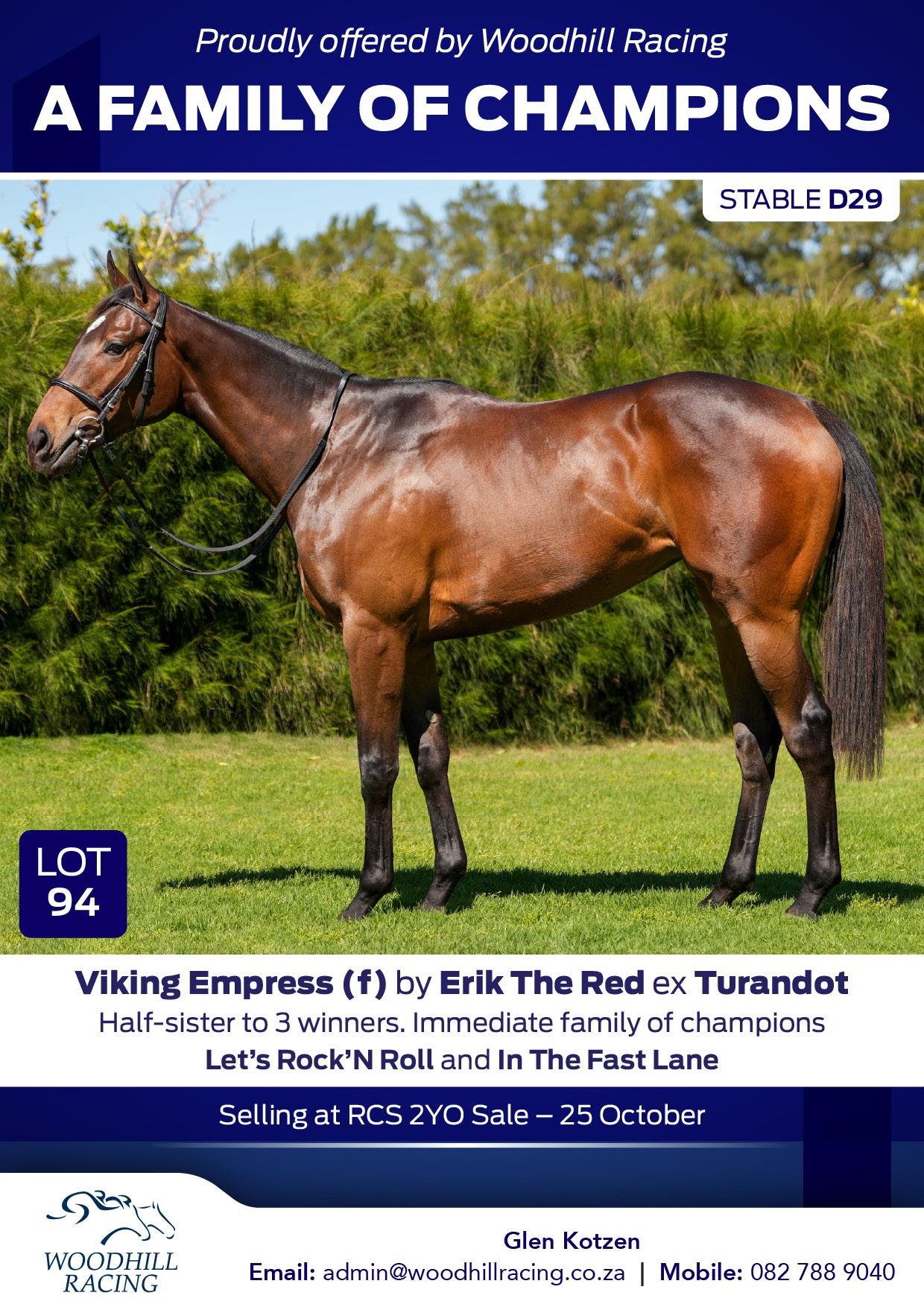 By last season’s Leading First Season Sire, closely related to Golden Palm, with the latter sired by Erik The Red’s close relative Master Of My Fate. His dam is a ½ to the dam of Alan Greeff’s top filly Golden Palm. A well-made, scopey colt who oozes quality.