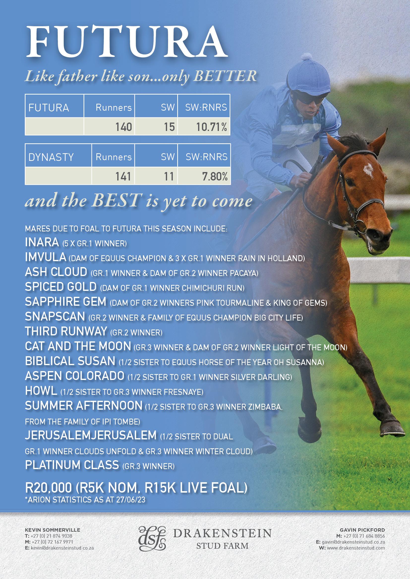 Out of the winning Jet Master mare Allez Afrique, a half-sister to Gr1 Cape Flying Championship hero O Caesour, the imposing colt hails from the family of champions Enchantress, Laverna and the ill-fated National Currency, to name but a few.
