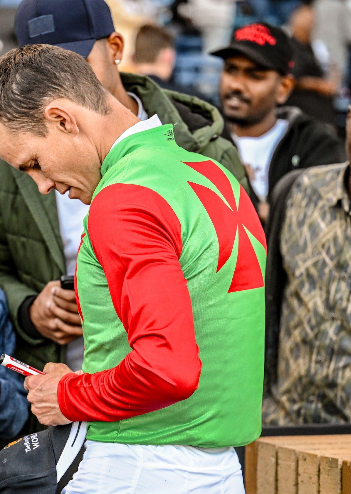 Who says the younger generation don’t have an appetite for racing? Richard Fourie signs a cap for a young fan at Hollywoodbets Greyville on Sunday.