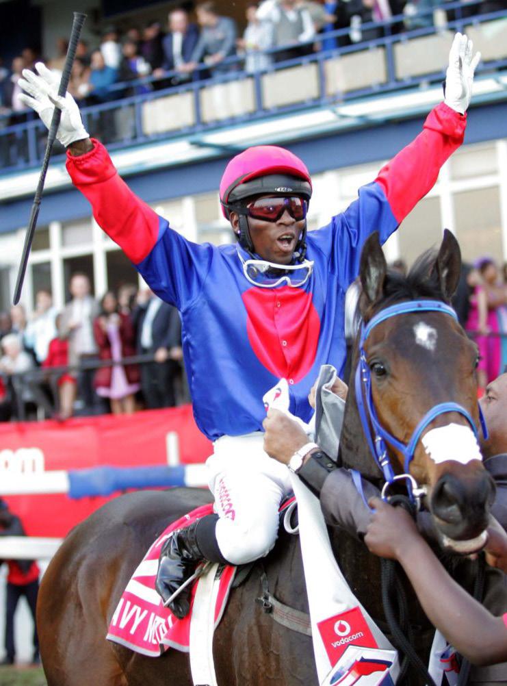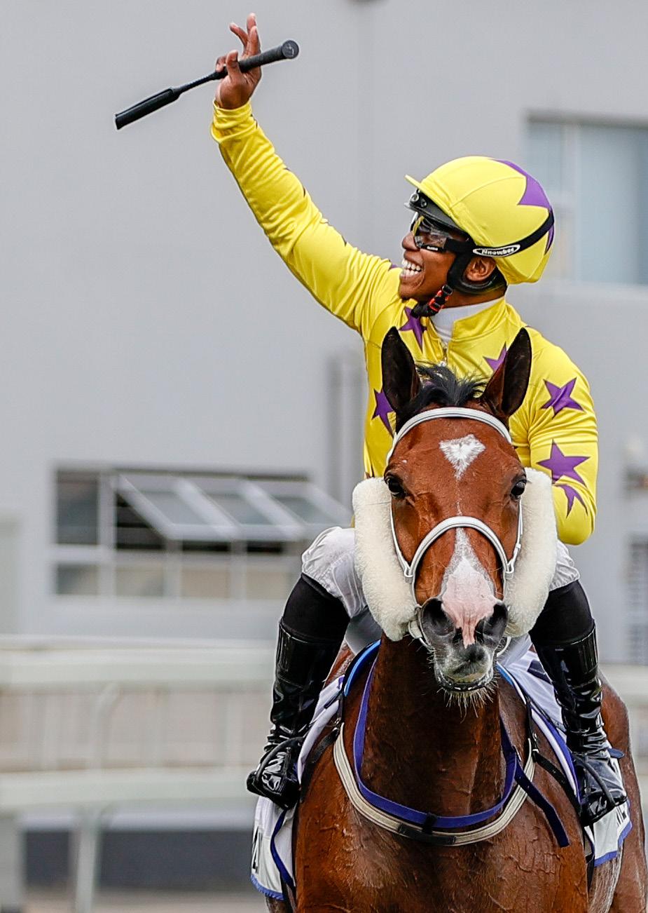 Louis Mxothwa salutes the crowd after the Hollywood Syndicate raced Time Flies won the KRA Listed East Coast Cup at Hollywoodbets Greyville on Saturday. The daughter of Dynasty was saddled by Crawford Racing assistant, James Crawford. Image courtesy of Candiese Lenferna.