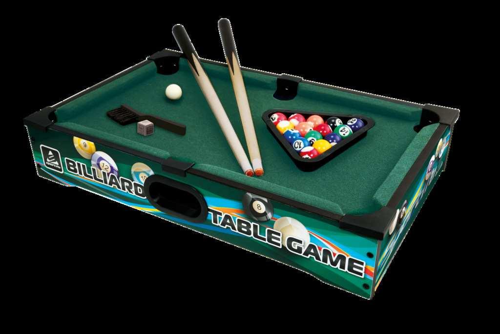 Portable pooltable game,complete with2 poolcues,16 poolballs,brush, triangle andcue chalks.Rule booklet. Size:51x31cm.