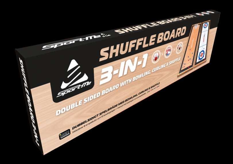 3 games in1:One side withBowlingand Shuffle andthe otherwithCurling.With 8 rollerballs and10 bowlingpins.Size:113 x35x3.2 cm.