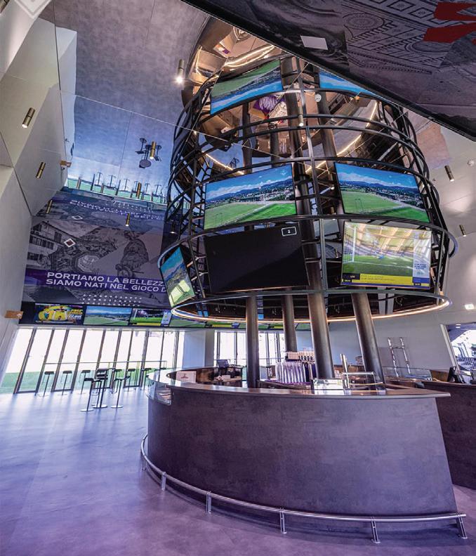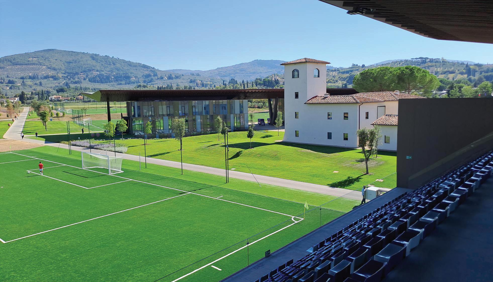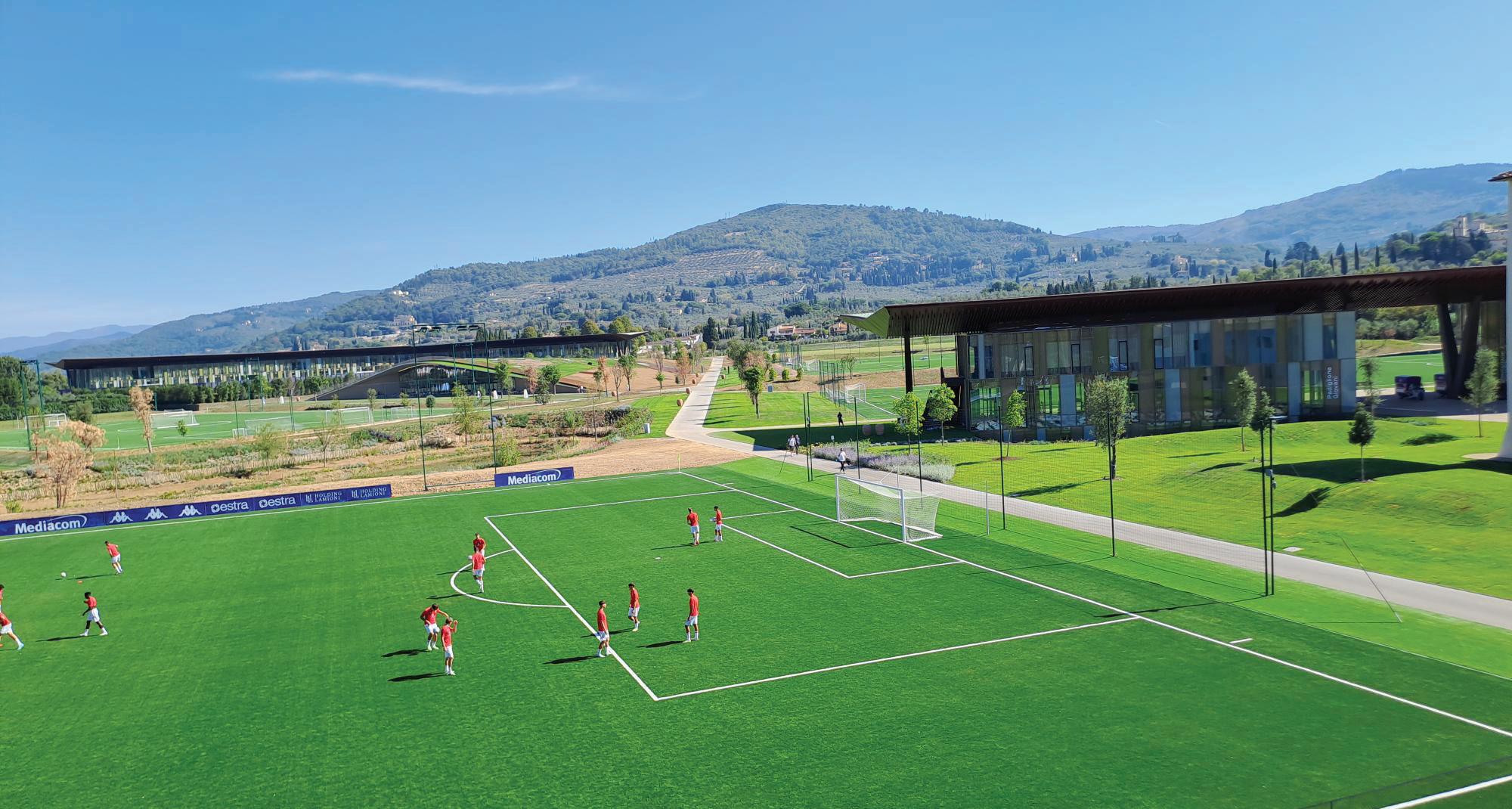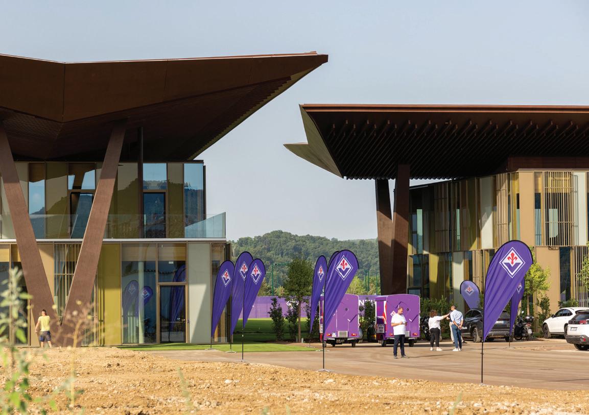 ettari, 10 campi regolari da gioco (5 in erba naturale, 5 ibridi e 2 dedicati alla scuola calcio), 2mini-stadi (rispettivamente da 1500 e da 3000 posti di capienza), 12 padiglioni, 67 u ci, 19 sale riunioni, palestre, piscine, saune, laboratori per il recupero e la prevenzione degli infortuni, bar con vetrate panoramiche sui campi da gioco, un centro medico e wellness con tanto di ambulatori, dentisti, podologi, parrucchieri e persino una cappella cristiana dedicata a Santa Caterina. Un ristorante realizzato con un’architettura che riprende la linea delle colline orentine, foresterie che ospiteranno i calciatori, con 74 camere da letto, dotate di tutti i comfort e nelle quali niente è lasciato al caso (ci sono persino le lenzuola ricamate con il logo del club). Gli spogliatoi sono 28 e c’è anche un Media Center all’avanguardia. Il tutto immerso nel verde, con 1200 nuovi alberi piantati, nell’assoluta priorità del rispetto dell’ambiente, garantita