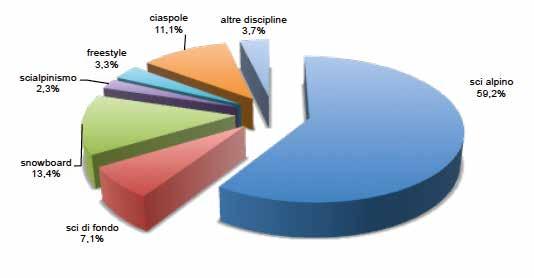 Pertanto, lo sci alpino detiene ben il 59,2% dell’intero sistema sportivo sulla neve, mentre la quota degli italiani snowboarders è pari al 13,4%. Coloro che utilizzano le ciaspole rappresentano una percentuale dell’11,1%, mentre lo sci di fondo conquista una quota del 7,1%. Freestyle e scialpinismo rappresentano, rispettivamente, il 3,3% e il 2,3%, sul totale degli italiani che praticano sport sulla neve, mentre una quota del 3,7% di italiani si dedicano ad altre discipline sportive.