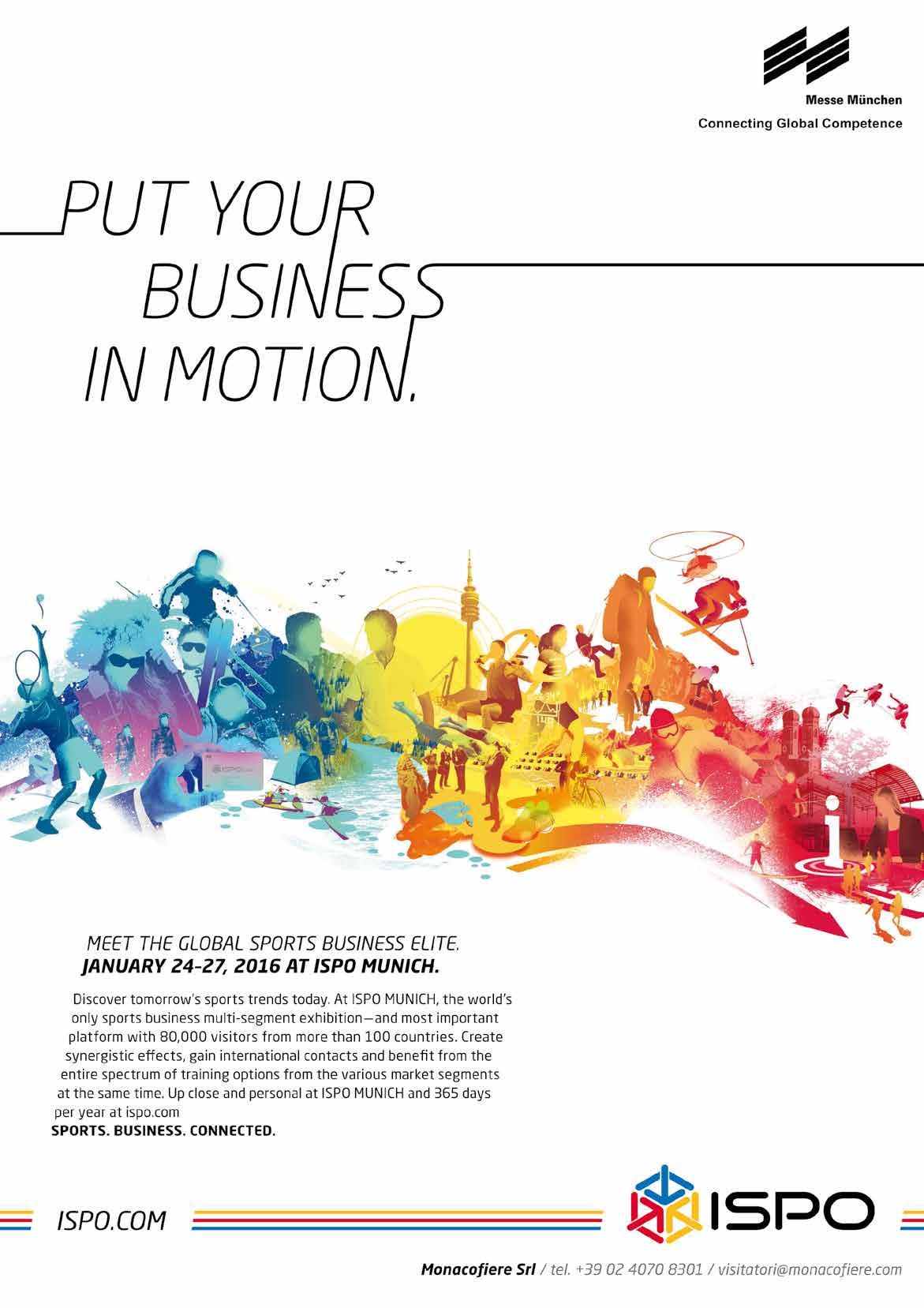 Così la nuova edizione di ISPO, in calendario dal 24 al 27 gennaio, vedrà riorganizzata completamente l’area espositiva, con l’obiettivo di offrire ai visitatori una più efficiente dislocazione delle aree e soprattutto adeguarsi alla trasformazione del mercato sportivo. “In quanto fiera multisettoriale, ISPO Munich non solo deve riflettere l’industria, ma anche richiamare l’attenzione ai nuovi potenziali business. Per questo, nonostante la sfida che ci si pone innanzi, ridistribuiremo 11 dei 16 padiglioni, convinti che il nuovo posizionamento offrirà ulteriori potenzialità e creerà sinergie tra i segmenti già stabiliti”, spiega Klaus Dittrich, CEO di Messe München.