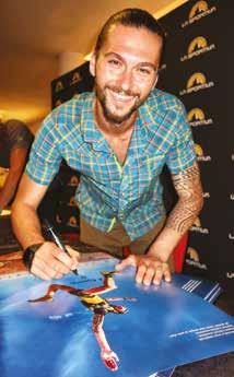 Sopra, Michele Graglia a Ulan Batar nella sede di La Sportiva Mongolia e mentre firma i suoi poster durante la LUT di Cortina