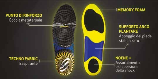 I l materiale Noene favorisce l’assorbimento e la dispersione dell’impatto; il supporto dell’arco plantare permette un’efficace stabilizzazione del passo; la schiuma - grazie al Memory Foamrende confortevole la camminata, mantenendo per tutta la sua durata lo stesso spessore e conservando le sue proprietà e la forma iniziale.