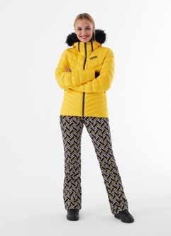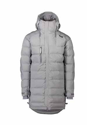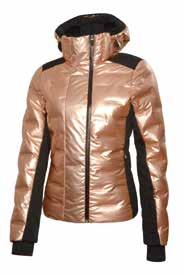 Realizzata in tessuto WD Metal la cui particolarità risiede nell’applicazione esterna della lamina poliuretanica caratterizzata da colorazione metallica. Questa lavorazione garantisce un buon livello di impermeabilità (10.000 colonne d’acqua), protezione dal vento e isolamento termico. L’elevata termocoibenza e la traspirabilità sono garantite da imbottitura in piuma. Il piumino a settori incollati evita la fuoriuscita della piuma e garantisce una maggiore performance di impermeabilità. Le altre caratteristiche: cappuccio regolabile e staccabile tramite zip nella parte posteriore e connector nascosto nella parte frontale del collo; polsini interni con foro ergonomico per il pollice; zip frontale asimmetrica impermeabile con camlock personalizzato; taschino porta ski-pass; fodera personalizzata per schiena e cappuccio; interno collo in confortevole tessuto velour con inserto centrale in soft shell per proteggere dallo sfregamento del casco; ghetta interna staccabile con elastico antiscivolo; regolazione fondo con coulisse interna; stampa Technology Box all’interno del capo.