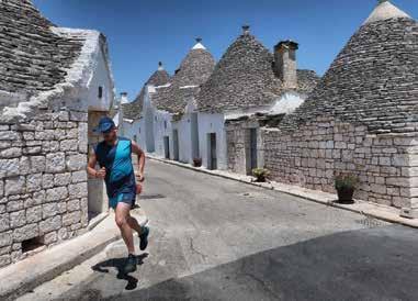 Verso le tipiche costruzioni di Alberobello - I trulli sono un tipo di costruzione conica in pietra a secco tradizionale della zona, che venivano edificati come ricoveri momentanei nelle campagne o abitazioni permanenti per gli agricoltori. Ci sono i trulli gemelli, c’è il trullo sovrano, ci sono trulli in ogni dove, da tutte le parti, a perdita d’occhio. Con me corre anche Simone e per noi, a ogni bivio, andare a destra o a sinistra è lo stesso, ci facciamo portare dall’istinto che a sua volta segue lo sguardo, attratto come sempre dagli angoli più incantati ma anche da i vicoli più remoti. Si corre senza fretta, curiosando il più possibile e godendo di una giornata nuovamente calda e spettacolare. Per la terza tappa facciamo una puntatina nella bella Matera, che non è in Puglia ma che è, diciamo così, di strada. Poi, sempre on the road, passiamo Taranto senza fermarci e puntiamo verso Otranto. Qui il mare è di un verde smeraldo, il periodo, inizio