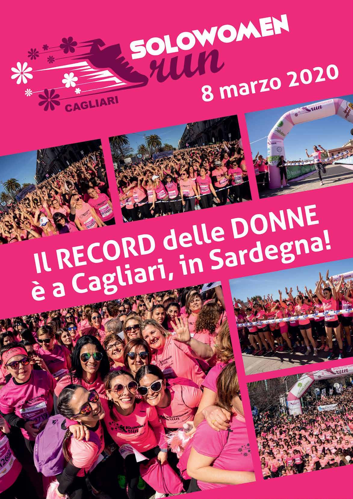 La Cagliari SoloWomenRun - la corsa rosa solidale organizzata da 42K in collaborazione con l’Apd Miramar – quest’anno si prepara a battere un nuovo record. Appuntamento domenica 8 marzo 2020, tetto massimo fissato a 20 mila partecipanti. Si ripete la formula consolidata, con un percorso open non competitivo da circa 5 km e uno competitivo challenge da circa 10 km con classifica finale. La Cagliari SoloWomenRun conferma la sua vocazione solidale, con la possibilità per tutte le associazioni di avviare un’attività autonoma di crowdfunding, acquisendo i pettorali a tariffe speciali. Le associazioni potranno partecipare anche al SWR Charity Goal presentando a info@solowomenrun.it un progetto che sarà valutato dal comitato etico SWR. I primi tre progetti saranno premiati con un contributo. O rganizzata per la prima volta nel 2015, la corsa è cresciuta costantemente, diventando uno degli eventi più attesi a Cagliari.