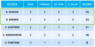 INFLUENCER - Tra gli atleti impegnati negli sport invernali, ci sono quelli che incarnano al meglio la figura del testimonial per un’azienda. Le variabili applicate alla scorecard prendono come riferimento la mole di conversazioni online che riguardano un atleta (buzz), l’ampiezza della sua fanbase, il tasso di engagement e il valore media potenziale generabile con l’attivazione e calcolato sulla base delle performance social storiche degli influencer. Tra questi è interessante vedere il riconoscimento e l’engagement social di due atlete in particolare: parliamo di Sofia Goggia, neocampionessa olimpica e Dorothea Wierer. L’analisi di profilazione effettuata sull’audience di Sofia evidenzia come la sciatrice sia la testimonial ideale per un brand che abbia un target tendenzialmente di sesso maschile (65%), di età compresa fra i 18 e i 25 anni.