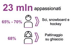 IDENTIKIT - Gli appassionati di sport invernali sono circa 23 milioni di persone che corrispondono al 39% degli italiani con almeno 14 anni di età con una preferenza di sci e snowboard per il pubblico maschile e pattinaggio artistico invece preferito da quello femminile. Il discorso cambia invece quando si entra nella sfera dei praticanti: questi sono circa il 5% degli italiani che corrispondono a circa 3 milioni di appassionati. Di questi, il 18% mantiene una pratica settimanale, mentre circa il 50% non va oltre le 2/3 volte all’anno. Tra le discipline sono sci e snowboard quelle preferite ma l’ice hockey è quella con la maggior incidenza (55%, circa 70 mila). Più del 30% del totale praticanti risulta appartenere alle fasce d’età dai 14 ai 19 e dai 34 ai 44 anni, a testimonianza della diffusa pratica familiare.