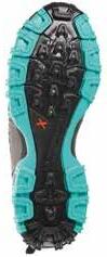 La suola bi-mescola FriXion Red presenta superfici di appoggio differenziate: la forma arrotondata dei tasselli esterni che salgono lateralmente a toccare l'intersuola, crea un angolo di appoggio graduale con il terreno mantenendo la stabilità anche in casi di torsioni estreme del piede.