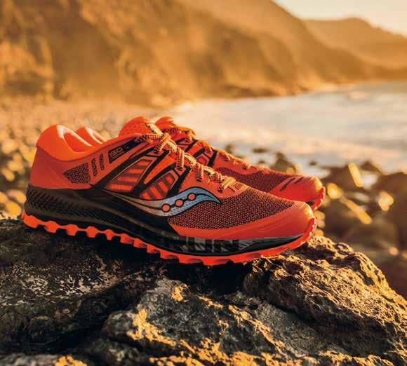 La tomaia è stata ridisegnata implementando il sistema di allacciatura Isofit, una speciale gabbia mobile che permette un fit personalizzato. Il piede alloggia in una calza morbida e traspirante, e le alette di chiusura rendono la tomaia un tutt’uno con il piede, garantendo comfort, sensibilità e stabilità. Lo speciale mesh ingegnerizzato è ora stato migliorato e reso più durevole, grazie alla speciale lavorazione a trama in cordura. Il puntale è ben strutturato ma non troppo invadente, creando la giusta protezione da eventuali ostacoli ma senza fastidiose pressioni che potrebbero causare l’insorgenza di unghie nere. Anche la coppetta posteriore mantiene la medesima filosofia: il tallone è mantenuto in asse dalla conchiglia, che risulta contenitiva ma non costrittiva. La stabilità risulta ulteriormente migliorata grazie alla presenza del Rock Plate all’avampiede, una piastra in Kevlar e carbonio che permette di assorbire al meglio le asperità del terreno. Inoltre lo stesso è posizionato in modo tale da favorire energicamente la spinta in fase di salita: a ogni sollecitazione risponde imprimendo una sorta di frustata, agevolando la rullata del piede e l’avanzamento. Il comparto ammortizzante è composto da un’intersuola in Power Foam e dalla topsole in Everun, un collaudato connubio che fornisce ammortizzazione e ritorno d’energia. L’adozione del Formfit Contour, una speciale sagomatura interna dell’intersuola, accoglie il piede e lo avvolge efficacemente, evitando movimenti indesiderati e creando un piacevole sensazione di comfort. Infine, la suola in Powertrac, la mescola più grippante di casa Saucony, che fornisce grande trazione in ogni condizione e su qualsiasi terreno. I tasselli alti 6 mm hanno una geometria che permette un miglior scarico del fango in situazioni di bagnato o di terra grassa.
