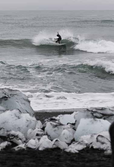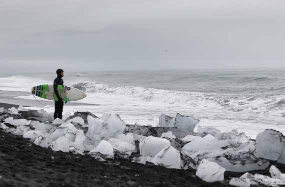 cascate impetuose. Poi una miriade di viste guidate di cui quella all’imperdibile laguna glaciale e alla relativa spiaggia nera in cui ogni giorno si arenavano piccoli iceberg cristallini. Qui... la sorpresa: un paio di surfer locali si preparavano ad affrontare il freddo oceano per cavalcarne le onde. Il cielo grigio, l’aria decisamente rigida e un vento crudele che la faceva percepire ancora più fredda. Il mare, inutile dirlo, era gelido, ma gli intrepidi surfer, sotto lo sguardo attonito dei nordic walker, ben imbustati in mute da almeno 5 millimetri si gettavano ugualmente alla ricerca del giusto pointbreak.