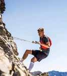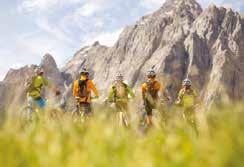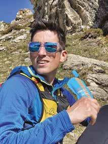 CON GIOVANNI STORTI E FRANZ ROSSI N oi, che in questo caso non siamo un solo un gruppo di persone ma diversi, più piccoli e suddivisi in vari periodi dell’estate, abbiamo scelto come base logistica, per le varie corse esplorative, il campeggio Monte Bianco La Sorgente: un luogo sito nel verde laddove la ripida strada asfaltata iniziale, che si insinua nella Val Veny, ripiana e la valle si allarga. Nella sola estate 2020, siamo stati al cospetto del Bianco in più occasioni e ogni volta abbiamo corso in una direzione diversa, tanto sono varie le diramazioni pedestri a disposizione. Con Giovanni Storti, del famoso trio Aldo Giovanni e Giacomo, e Franz Rossi, coautore dei vari libri del comico, siamo saliti più in quota, grazie alla strada asfaltata che si allunga nella valle, per poi continuare sul suo proseguimento sterrato e quindi imbucarci, a destra, in uno dei tanti sentieri che si diramano nei due versanti. Un single track, quello scelto, che serpeggiando nel verde dei pascoli a 2.000 metri porta al ghiacciaio del Miage e ai relativi e omonimi laghi. Di questi, uno è oramai quasi prosciugato mentre un altro, bello e suggestivo, visto dall’alto è a forma di cuore. Il rumore dello scioglimento del ghiacciaio è l’unico “inquinamento acustico” in un mare di silenzio condito da aria fresca e pura. Si percepisce pace in ogni direzione. Si sta bene.