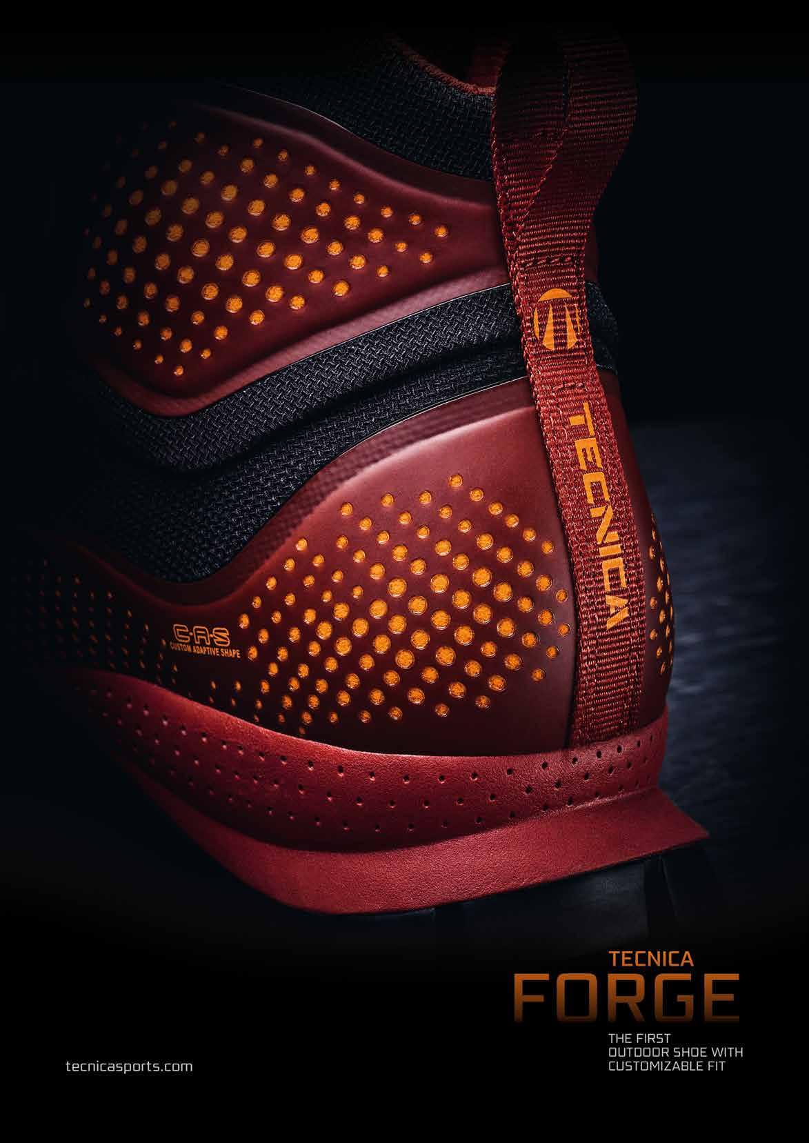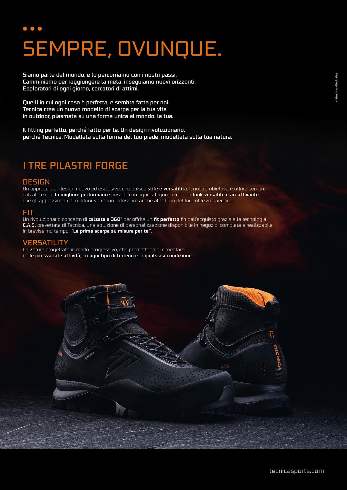 FORGE S / Calzatura da trekking leggera, precisa ed altamente tecnologica. Questa è la versione con tomaia interamente sintetica, costruita con un tessuto innovativo sviluppato da Tecnica, duraturo e in grado di offrire l’elasticità necessaria a conformarsi all’anatomia del piede in fase di termoformatura. Lo strato in TPU applicato a caldo aumenta la protezione e la durata.
