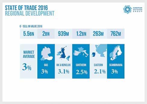 Eccoli qui dunque i numeri principali di questo 2016. Il fatturato totale del mercato è cresciuto dai 5,33 miliardi del 2015 ai 5,47 di quest’anno, con un incremento del 3,4% in termini di volume. A livello di fatturato l’aumento del sell-in è stato del 3%. Tutte le categorie prodotto hanno registrato una crescita, particolarmente significativa in termini di volume quella di abbigliamento (6%), seguita da materiale d’arrampicata (3,4%), accessori (2,6%), e zaini (2,5%). Negativi solo i sacchi a pelo (-2,8%), le calzature (-1,1%) e le tende (-0,8%). Facendo una distinzione tra prodotto estivo e invernale, l’incremento è stato del 2% (sia in termini di volume che di fatturato) nel primo caso e del 2,6% (di fatturato) e 3% (in volume) nel secondo. Per quanto riguarda invece il market share per aree geografiche, a farla da padrona è sempre l’area GAS (Germania-Austria-Svizzera) con il 38%, seguita dall’Europa meridionale con il 22%, dal Regno Unito e dal Benelux con il 17%, la Scandinavia con il 14%, l’Est Europa con il 5% e la Russia con il 4%. La maggior parte delle regioni ha registrato una crescita, a partire dall’area GAS con il 3%, UK e Benelux del 3,1% e la Scandinavia del 3%.