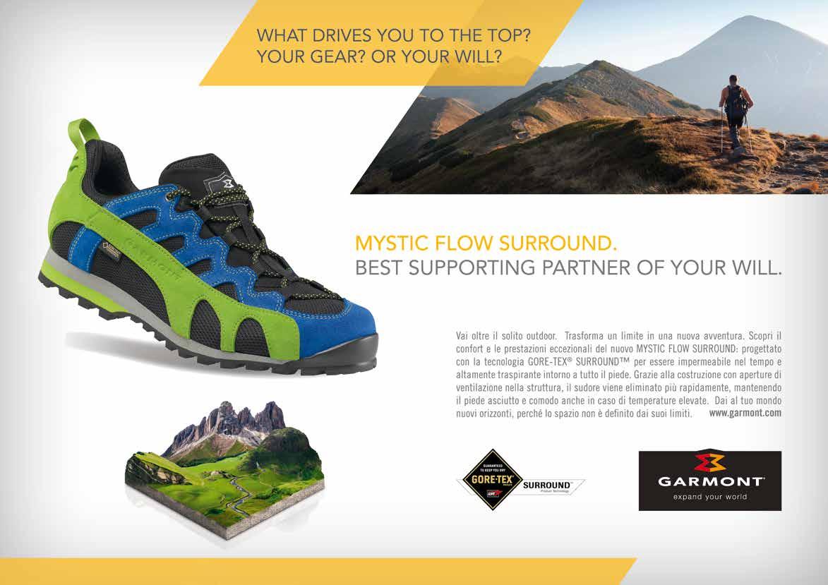 La prima impressione? Che la tempesta sia alle spalle e all’orizzonte ci sia solamente il sole. L’ottimismo in casa Garmont c’è ed è ampiamente giustificato, dopo che l’azienda veneta ha annunciato il salvataggio societario da parte di Veneto Sviluppo e il business plan per il presente e per il futuro (vedi news a pag. 4 di questo numero). Così il brand si presenta all’Outdoor Show con i migliori auspici e con una collezione prodotti rinnovata e in parte ampliata con una proposta di calzature per ogni tipo di attività in montagna, dall’alpinismo tecnico all’escursionismo veloce. Pumori ad esempio è un modello sviluppato per guide alpine e scalatori tecnici, dotato di tomaia interna in Cordura e ghetta esterna in tessuto Superfabric e Schoeller. La famiglia Mystic è invece composta da calzature a taglio basso dedicate agli appassionati giovani e dinamici che praticano hiking e uscite di più giorni con carichi moderati. Dotate di tecnologia GTX tradizionale o in versione Surround, sono perfetti per affrontare ogni tipo di terreno, anche il più tecnico, e sono realizzati con una costruzione che offre una calzata sicura e avvolgente.